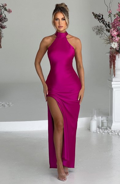 $111.97Marilyn is our gorgeous off the shoulder creation, made in our luxury bias cut satin which drapes beautifully over the body and gives an elegant, draped skirt. With subtle gathers and an ultra thigh high split for added sexiness, wear her with sleek hair and minimal jewellery. Colour: Blush. Premium…