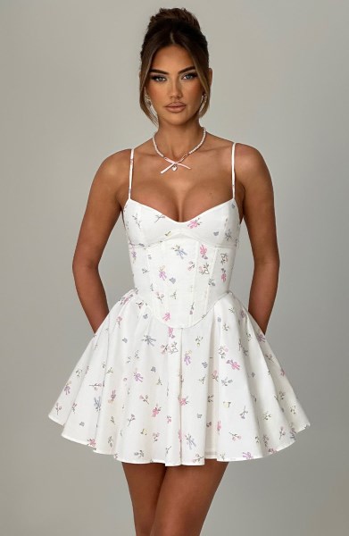 Analeigh is effortlessly dressed up or down, crafted in a lightweight cotton blend with boned corset and sweetheart neckline. With a lace up back for a super cinched waist, the skirt is full and the straps are adjustable for your perfect fit. Colour: White Multi Floral Print. Premium non-stretch cotton…