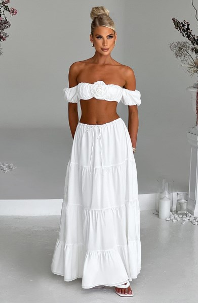 Cut from crisp white cotton blend fabric, the Carmen set is made for brunching on balmy days. This skirt is maxi length and sits elegantly lower than your waist, on your hips for a relaxed, bohemian feel. The tiered skirt is super loose and is finished with a tie detail.…