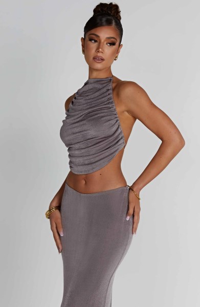 Feel glowy and gorgeous in the Fifi top, made in our high shine jersey which has a beautiful sheen. This backless design fastens with a tie to the back and is complete with a high neck and all-over draped design to the front. Pair yours with the matching Fifi skirt and a sleek knot.
