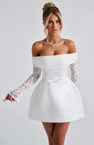 Featuring a rounded bubble shaped skirt, cinched waist and long, floral lace sleeves, Georgianna’s on our new season wishlist. The design is made from luxe non-stretch satin, contrasted by delicate lace sleeves and fold-over bardot neckline. Colour: Ivory. Premium non-stretch satin. Body is fully lined. Stretch floral lace. Fold-over detail…