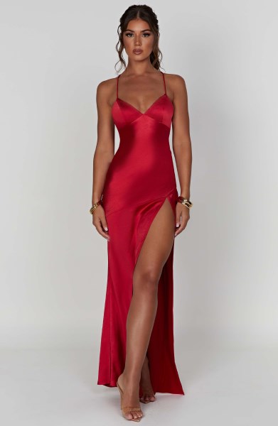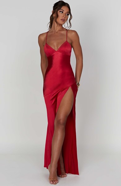 If you are looking for a super soft, romantic silhouette that skims over the body and enhances your figure, meet the Isobel maxi. Made from our silky soft satin with a bias cut, Isobel features a plunge neck, super low back with tie straps and a thigh high split.