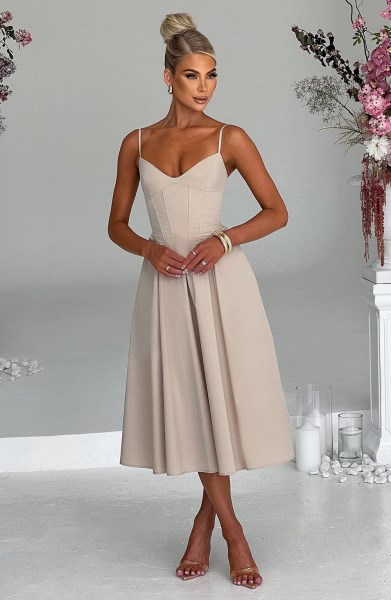 Make an entrance in Mariella, the party midi of your dreams this season. Super feminine and chic, this dress is truly an icon with a structured, corseted bodice that’s boned to cinch your waist and contrasted by a full, voluminous skirt. Colour: Beige. Non stretch cotton blend fabric. Corseted bodice…
