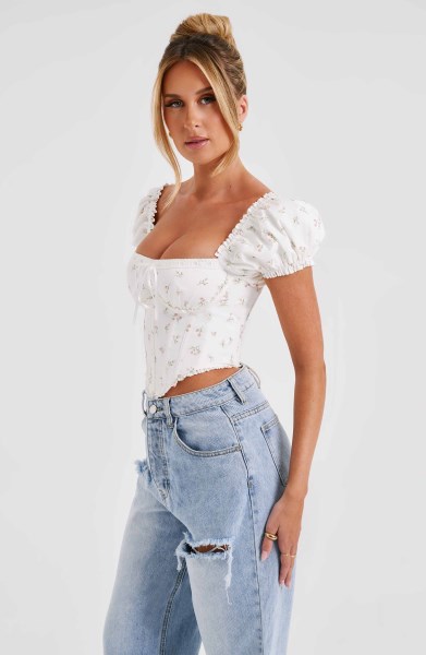 Must-have milkmaid corsets are what we’re wearing ALL season with our fave denim and mule heels. Matilda has dreamy puffed sleeves with a snatched waist and pretty tie detail to the bust. Colour: Blush Floral Print. Premium non stretch cotton. Underwired bust. Puffed sleeves. Waist cinching. Tie to bust. Dipped…