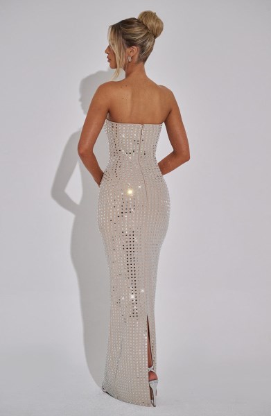 Indulge in the luxurious Neriah Maxi Dress in Nude. Crafted from premium stretch mesh fabric and fully lined, it boasts a strapless neckline and all-over embellishment with dazzling large square hotfix rhinestones. Featuring a body hugging fit and a centre back split, it exudes elegance and sophistication. A hidden zipper fastening adds to its exclusive design, making it the perfect choice for any special occasion.