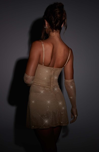 Sparkle into the night wearing the show stopping Pixie mini (gold sparkle), a dress cut from our special custom mesh with all-over sparkle detail. The fit skims over your figure, flaring ever so slightly at the skirt with a small split for just the right amount of leg. Pixie is complete with underwired cups to frame and lift the bust. Style with the Pixie gloves and your highest heels.