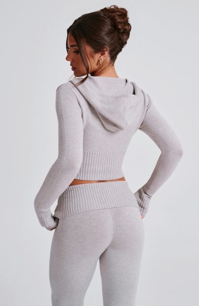 Elevate your off duty wardrobe with the Portia Knit Hoodie. This cropped hoodie features a fitted silhouette with a 2-way zipper and drawstring for the perfect fit. Complete your look with the matching Portia knit Pants. Colour: Light Grey Marl. Cropped length. Unlined. Fitted. Fitted sleeves with wide 2×2 rib…