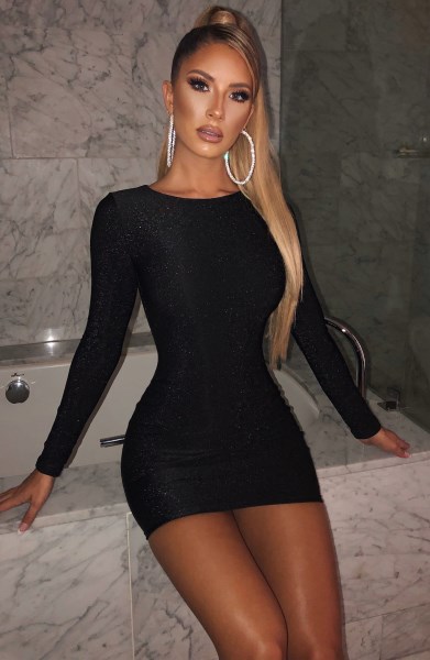 Colour: Black sparkle. Polyester Lurex Spandex. Double lined. Long sleeve. Stretchy material. Moulds to body figure. Hidden zip at back. Mini Length. Sierra is a Size XS & Wears an XS.She is 167cm tall & is D breast cup.