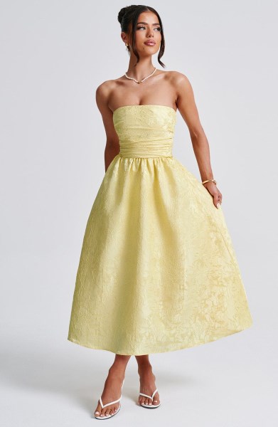 A dress to wear all seasons, Saoirse in Lemon is cut from our prettiest floral jacquard fabric in a midi length with super full skirt lined with tulle for extra volume. This strapless style has boning in the bodice for a cinched waist, with pleating and gathered detailing. The look is complete with lace up back. Wear with a pointed heel and chic hair up.????