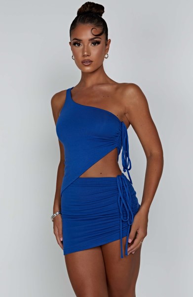 Get that IT girl energy in the Stormi mini, designed with a cool, asymmetric cut and ruched detailing to one side. The skirt is complete with a tie detail to one side and looks perfect paired with the matching Stormi mini skirt, a cool silver bag and minimal heels.